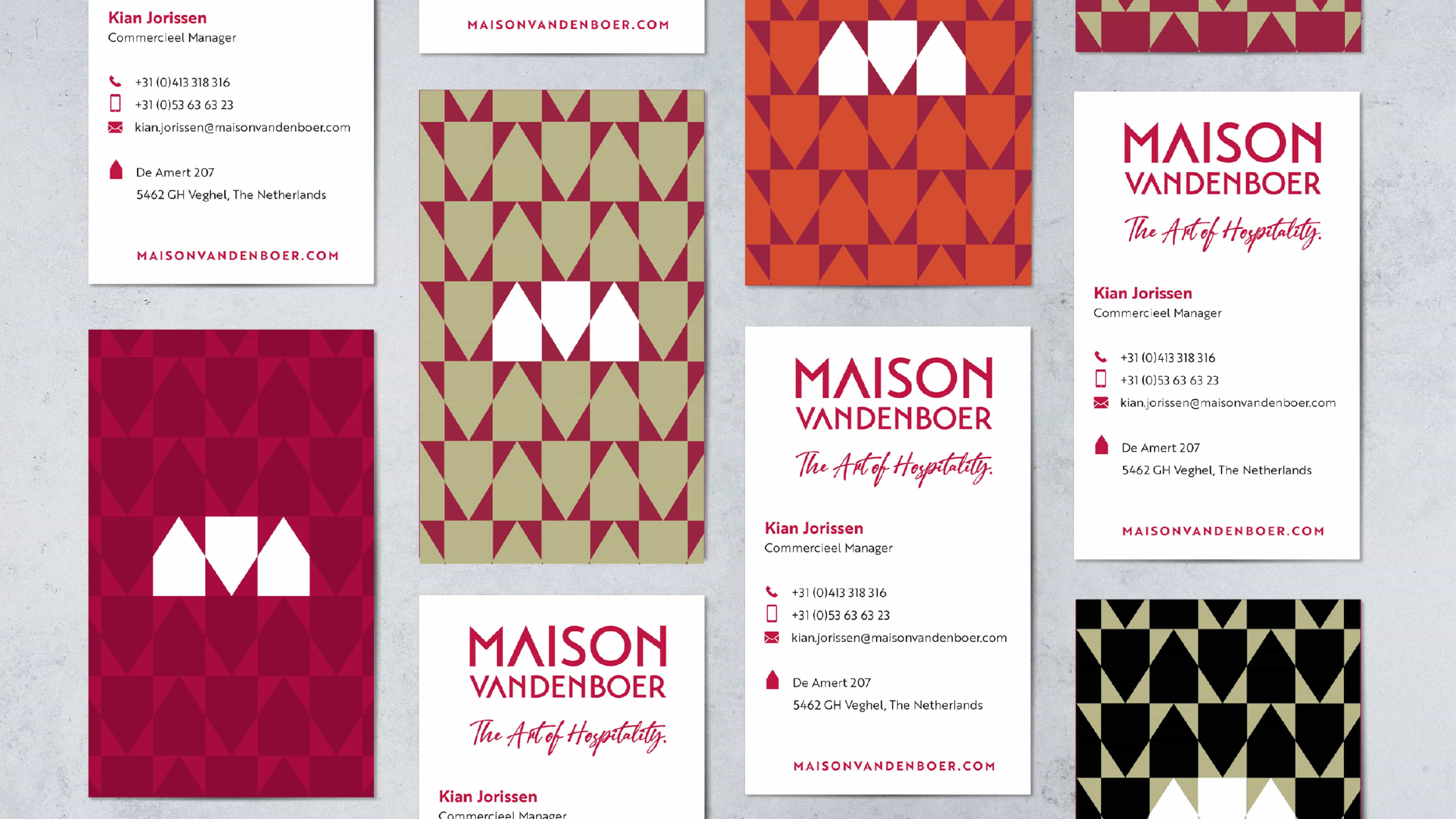 Voor Maison van den Boer ontwikkelde ik een vernieuwde merkidentiteit die luxe, gastvrijheid en vakmanschap samenbrengt. De visuele stijl combineert elegante typografie met grafische patronen geïnspireerd op hospitality en architectuur.
